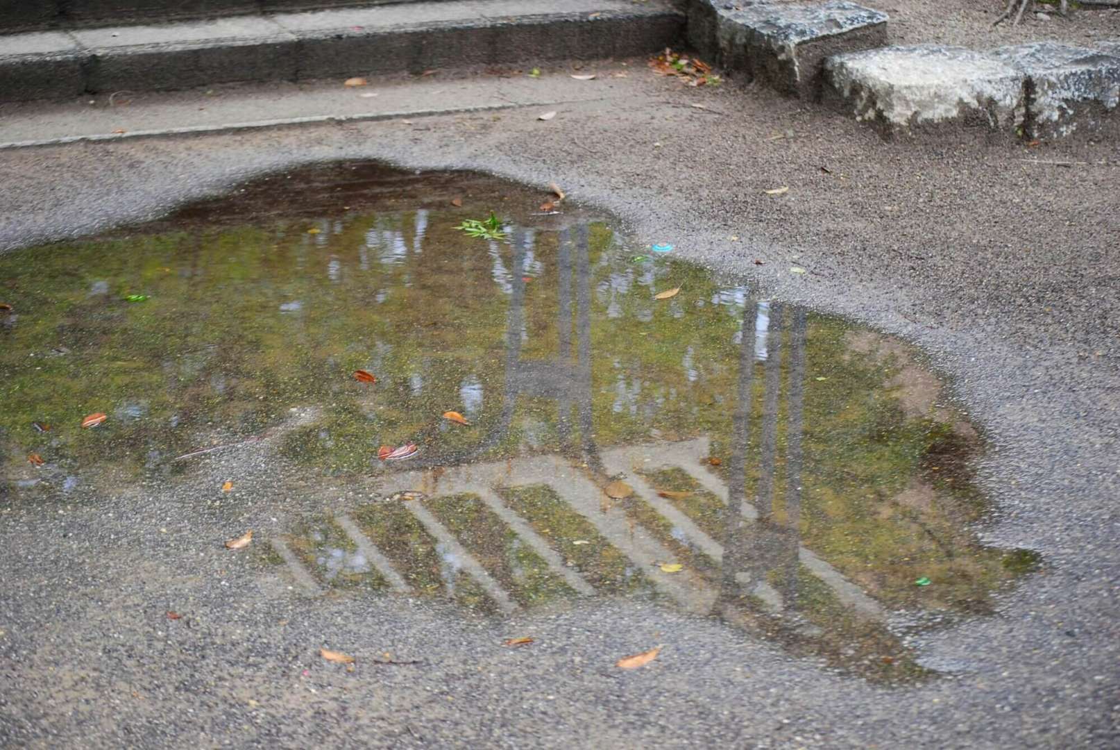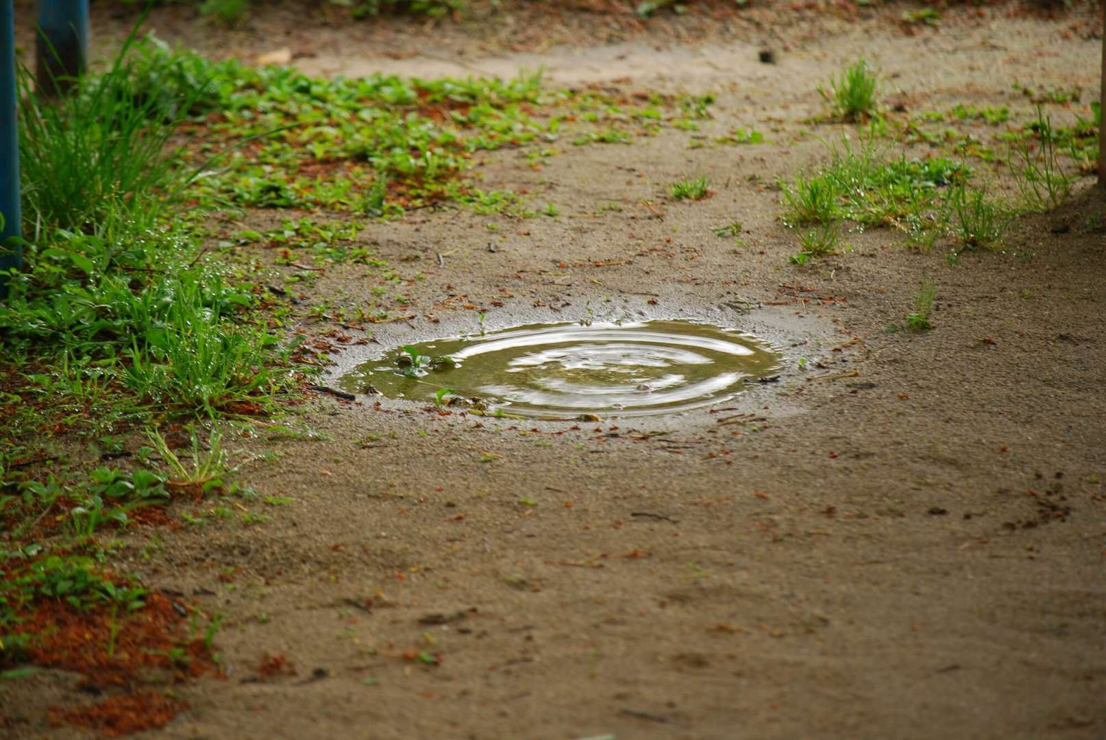 人が歩いたり車が出入りしたりする場所では、少しずつ地盤が沈み込み、目にはわかりにくい凹みができます。そこに雨が降ると小さな窪地となり、水が溜まりやすくなります。